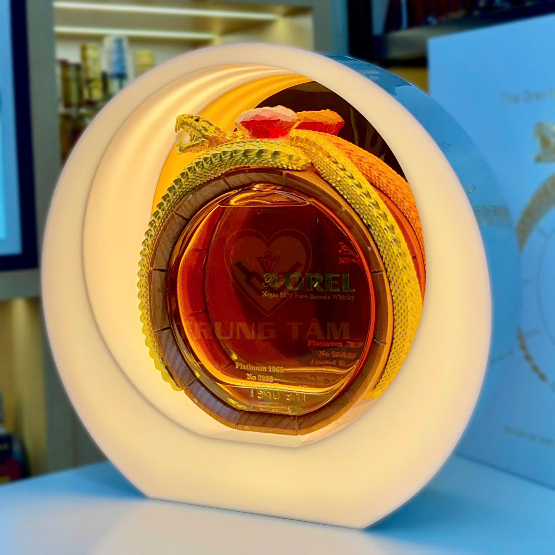 Thiết kế sang trọng, vàng ánh kim tạo cảm giác quyền quý và trang trọng. Đây là món quà độc đáo dành cho người sưu tầm, doanh nhân hoặc các dịp chúc mừng trọng đại. Rắn là biểu tượng cho trí khôn, sự uyển chuyển và tài lộc, đặc biệt ý nghĩa trong năm tuổi. Whisky The Orel không chỉ là rượu, mà là tác phẩm nghệ thuật mang tính phong thủy sâu sắc. Hãy để món quà này truyền tải lời chúc năm mới khôn ngoan, phát đạt và sung túc.